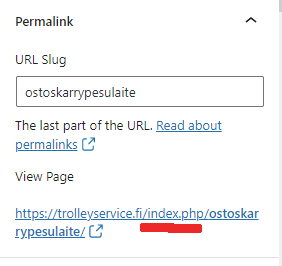 Home › Forums › Support › How do I change an existing URL? This topic has 7 replies, 4 voices, and was last updated 4 years, 4 months ago by Elvin. Viewing 8 posts - 1 through 8 (of 8 total) Author Posts November 13, 2021 at 10:23 am #2003126 Michael I want to change the url from an existing page (from https://nlp-training.org/about-michael-beale/ to https://nlp-training.org/nlp-trainer-michael-beale/) What’s the best way of doing this? Thanks, Michael November 13, 2021 at 4:27 pm #2003335 YingStaff Customer Support Hi Michael, If I understand correctly, you just need to change the page’s slug to the whatever you want for the new URL, I shot a small clip for you: https://www.screencast.com/t/VnWu2mHL7 November 13, 2021 at 11:54 pm #2003480 Michael Brilliant, thank you, Michael November 14, 2021 at 12:25 pm #2004190 YingStaff Customer Support No problem 🙂 November 28, 2021 at 9:17 pm #2028541 Kris Dear Ying, What if the slug already has the correct page name? https://trolleyservice.fi/wp-content/uploads/2021/11/slug.jpg I have index.php there between the sitename and slug. https://trolleyservice.fi/index.php/ostoskarrypesulaite/ How do I get rid of that index.php there? Best regards, Kris November 28, 2021 at 9:57 pm #2028568 ElvinStaff Customer Support Hi Kris, Can you go to Settings > Permalinks and check if your permalink Common Settings have /index.php/ in it? If it does, you can remove it from there. November 28, 2021 at 10:38 pm #2028623 Kris Thanks Elvin! I set it up Post Name so all good now, mate. (phew, that was a bit basic, eh 🙂 Cheers, Kris November 28, 2021 at 10:51 pm #2028633 ElvinStaff Customer Support No problem. Glad you got it sorted. 😀 Author Posts Viewing 8 posts - 1 through 8 (of 8 total) You must be logged in to reply to this topic. Log In Username: Password: Keep me signed in Log In