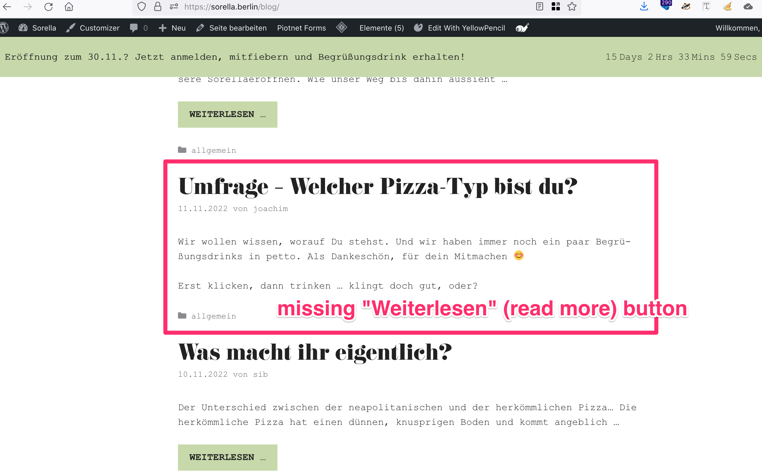 Home › Forums › Support › Missing “Read more” button on ONE post This topic has 1 reply, 2 voices, and was last updated 3 years, 5 months ago by David. Viewing 2 posts - 1 through 2 (of 2 total) Author Posts November 15, 2022 at 7:29 am #2416444 Sascha Hi on this site, the posts are on the default blog-page & start (via query loop). On both pages, the read-more-button below the post “Umfrage” is missing, as you can see on this screenshot. Can you please help me fixing this? Admin-Login in private info-field. Thank you in advance and kind regards, Sascha November 15, 2022 at 8:33 am #2416812 DavidStaff Customer Support Hi there, you would have to edit the Query Loop and: 1. Select the Block displaying your Post Excerpt. And disable the Use default more link 2. Add a GB Buttons block to create a new Read More. Author Posts Viewing 2 posts - 1 through 2 (of 2 total) You must be logged in to reply to this topic. Log In Username: Password: Keep me signed in Log In
